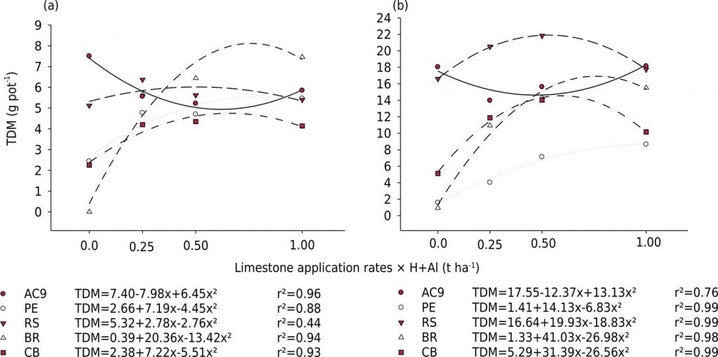 Chemical speciation of the soil solution is an important tool to identify Al species related to phytotoxicity. In some Brazilian acid soils, the Al extractable by the KCl 1.0 mol L -1 solution (Al-KCl) exceeds 10 cmol c kg -1 and even then, in some situations, it does not cause toxicity to the plants. This study aimed to evaluate the relationship between these high concentrations of Al-KCl found in some Brazilian acid soils and the activity of the different Al chemical species in the soil solution, as well as the response of soybean and corn plants to lime application. Subsurface horizon (B) samples of five soils were collected in four states of Brazil (AC, PE, RS, and SC) from areas that had never been cultivated. The samples were then given increasing rates of limestone, equivalent to that required to neutralize 0, 0.25, 0.5, and 1.00 times the contents of H+Al and were incubated for 98 days. After that period, the soils were fertilized and planted to soybean and corn in the greenhouse for 60 and 45 days, respectively, in 2015. The experimental units consisted of 8 L pots, filled with 5 kg of soil (dry basis). After each crop, the plants and soil samples were collected to determine the leaf, stem, and root dry matter, and chemical composition. In the soil solution, cations and anions, pH, electrical conductivity, and dissolved organic carbon were quantified. The distribution of the Al species was evaluated using the program Minteq. Free Al (Al 3+ ) was the species found in highest proportion in treatments without limestone, in all soils. Application at the lowest limestone rate, equivalent to 25 % of that required for H+Al neutralization, was sufficient to decrease Al activity in the soil solution to levels considered non-toxic to plants in four of the five soils. High levels of Al-KCl are not related to manifestation of toxicity and to Al 3+ activity in the solution of Hapludult (Acre profile 9; AC9) and Hapludult (Rosario do Sul; RS) since dry matter (DM) production in these soils was little influenced by liming, unlike what occurred in the Hapludult (Pernambuco; PE), Humudepts (Bom Retiro; BR), and Kandiudox (Curitibanos; CB) soils, in which Al-KCl contents were related to Al activity in the solution and to DM production of the plants grown in them.