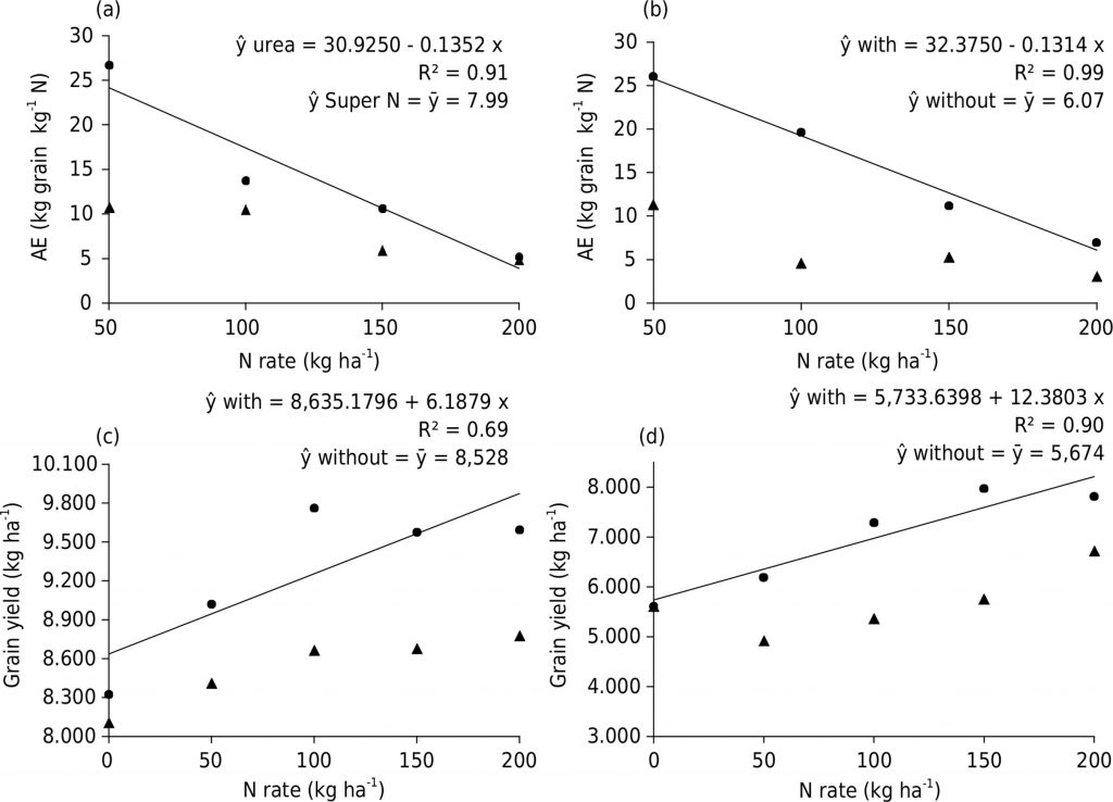 The biological nitrogen fixation (BNF) process in grasses is caused by diazotrophic bacteria, particularly Azospirillum brasilense. However, studies are lacking on BNF efficiency to define how much mineral nitrogen (N) can be applied to achieve more sustainable high yields. Furthermore, there should be an analysis of whether urea with the urease enzyme inhibitor NBPT is less harmful, benefiting BNF in grasses. The objective of this study was to evaluate the effect of N sources and N rates associated with inoculation with Azospirillum brasilense regarding foliar diagnosis and leaf chlorophyll index (LCI), agronomic efficiency (AE), and corn grain yield in the Cerrado (Brazilian tropical savanna) region. The experiment was conducted in a no-tillage system in a Latossolo Vermelho Distroférrico (Oxisol). A randomized block experimental design was used with four replications in a 2 × 5 × 2 factorial arrangement as follows: two N sources – urea and Super N, urea with urease enzyme inhibitor NBPT [N – (n-butyl thiophosphoric triamide)]; five N rates (0, 50, 100, 150, and 200 kg ha-1) applied in topdressing; and two seed inoculation treatments, one with and one without A. brasilense. N rate positively influenced the LCI and concentrations of N, S, and Mn in leaves, and may increase the concentrations of P, Cu, and Fe; however, higher N rates can reduce AE. The N sources had similar effects, and therefore urea is recommended for N fertilization. Inoculation with A. brasilense decreased leaf concentration of Fe and increased LCI, leaf concentration of P, AE, and corn grain yield; the use of this diazotrophic bacterium is therefore viable even when high rates of N are applied.