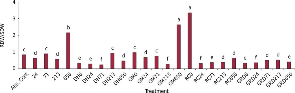 Inoculation with arbuscular mycorrhizal fungi (AMF) is a strategy to improve the efficiency of forest plantations, reducing costs and increasing the survival of plant species. The objective of this study was to assess the response and mycorrhizal dependency of seedlings of the forest species Apuleia leiocarpa (Vogel) J.F. Macbr to inoculation with AMF. The experiment was conducted in a completely randomized design using a 5 × 5 factorial arrangement with six replications. The treatments consisted of combinations of five P rates (0, 24, 71, 213, and 650 mg kg-1) with five types of inoculations with AMF (inoculation with the fungi Rhizophagus clarus, Gigaspora margarita, Dentiscutata heterogama, inoculation with an AMF mix of these three species, and a treatment without inoculation). The A. leiocarpa showed the highest biomass accumulations in inoculation with D. hetorogama combined with the P rates of 213 and 650 mg kg-1, and in the AMF mix combined with the P rates of 71, 213, and 650 kg-1. Biomass accumulation showed a linear, positive response to inoculation with D. heterogama combined with the different P rates, and a positive square root fit to inoculation with the AMF mix. The plants inoculated with G. margarita had no significant biomass accumulation. The plant species had a positive response to inoculation with R. clarus combined with the lowest P rates; however, it had a negative response to combination with the highest P rate (650 mg kg-1). The relative benefit of inoculation with these fungi was more than 100 % in most treatments, showing the high mycorrhizal dependency of A. leiocarpa and the nutritional benefit of AMF inoculation for this species. However, this response is dependent on the fungus species that colonize the plant roots. The best combination between fungus and P rate was inoculation with the AMF mix combined with the P rate of 71 mg kg-1.