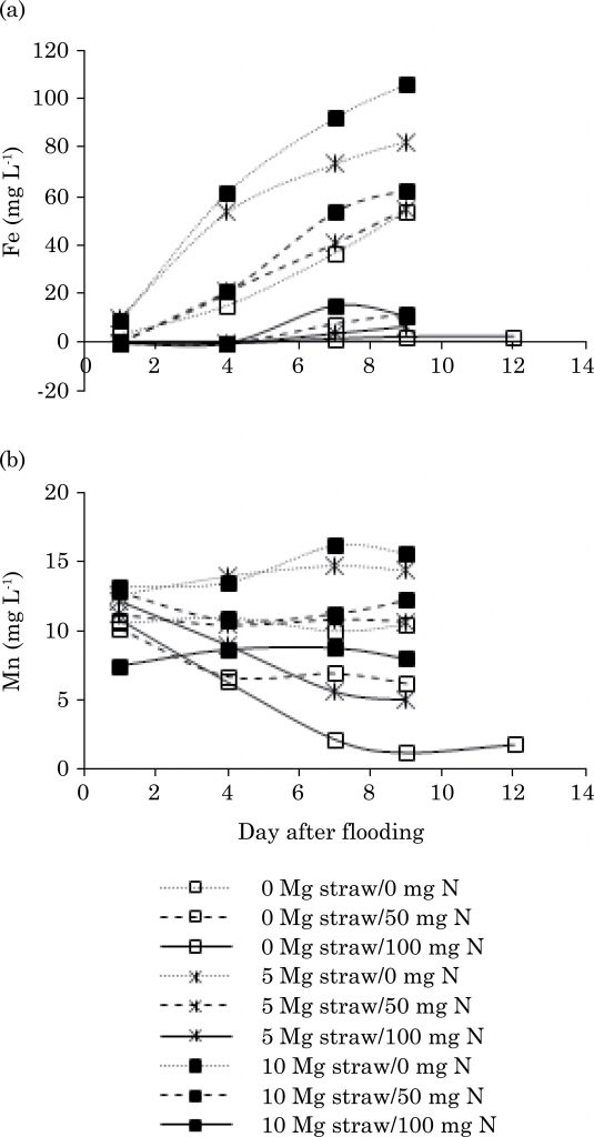 Among the greenhouse gases, nitrous oxide (N2O) is considered important, in view of a global warming potential 296 times greater than that of carbon dioxide (CO2) and its dynamics strongly depend on the availability of C and mineral N in the soil. The understanding of the factors that define emissions is essential to develop mitigation strategies. This study evaluated the dynamics of N2O emissions after the application of different rice straw amounts and nitrate levels in soil solution. Pots containing soil treated with sodium nitrate rates (0, 50 and 100 g kg-1 of NO−3-N) and rice straw levels (0, 5 and 10 Mg ha-1), i.e., nine treatments, were subjected to anaerobic conditions. The results showed that N2O emissions were increased by the addition of greater NO−3 amounts and reduced by large straw quantities applied to the soil. On the 1st day after flooding (DAF), significantly different N2O emissions were observed between the treatments with and without NO−3 addition, when straw had no significant influence on N2O levels. Emissions peaked on the 4th DAF in the treatments with highest NO−3-N addition. At this moment, straw application negatively affected N2O emissions, probably due to NO−3 immobilization. There were also alterations in other soil electrochemical characteristics, e.g., higher straw levels raised the Fe, Mn and dissolved C contents. These results indicate that a lowering of NO−3 concentration in the soil and the increase of straw incorporation can decrease N2O emissions.