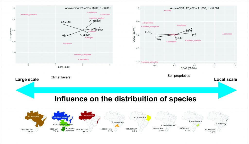 At a large scale, the climate influences the distribution of Atta sp. across Brazil.