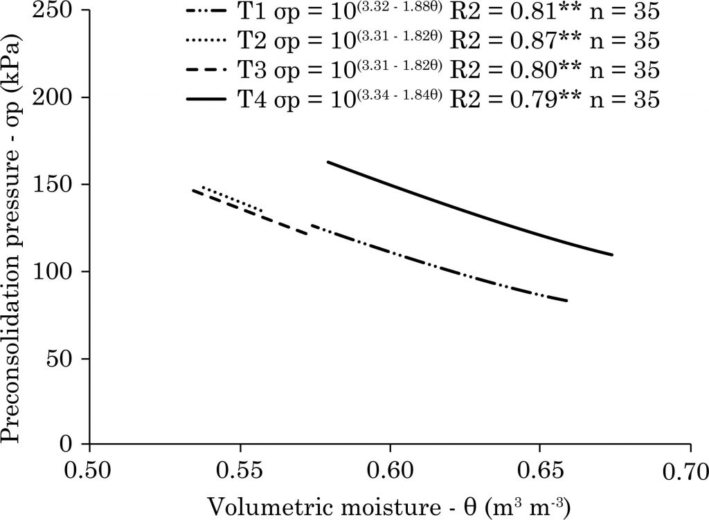 The expansion of the sugarcane industry in Brazil has intensified the mechanization of agriculture and caused effects on the soil physical quality. The purpose of this study was to evaluate the limiting water range and soil bearing capacity of a Latossolo Vermelho distroférrico típico (Rhodic Hapludox) under the influence of different tractor-trailers used in mechanical sugarcane harvesting. The experiment was arranged in a randomized block design with five replications. The treatments consisted of green sugarcane harvesting with: harvester without trailer (T1); harvester with two trailers with a capacity of 10 Mg each (T2); harvester with trailer with a capacity of 20 Mg (T3) and harvester and truck with trailer with a capacity of 20 Mg (10 Mg per compartment) (T4). The least limiting water range and soil bearing capacity were evaluated. The transport equipment to remove the harvested sugarcane from the field (trailer) at harvest decreased the least limiting water range, reducing the structural soil quality. The truck trailer caused the greatest impact on the soil physical properties studied. The soil load bearing capacity was unaffected by the treatments, since the pressure of the harvester (T1) exceeded the pre-consolidation pressure of the soil.