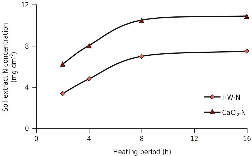 The use of chemical methods to assess the soil organic nitrogen (N) potentially available to plants is not a common practice in Brazil. However, associated with others, this tool might improve efficiency in the use of waste and nitrogen fertilizers. In our study, chemical methods were tested to assess potentially available soil N in samples of 17 representative soils of the western plateau of the state of São Paulo (10 Oxisols and 7 Ultisols). Available soil N was extracted from the collected soil samples using moderate (ISNT-Illinois Soil Nitrogen Test) and mild (hot water and heated solutions of 2 mol L-1 KCl and 0.01 mol L-1 CaCl2) extraction methods. The levels of potentially available N obtained from these chemical methods were correlated with dry matter (DM) and N uptake (Nup) by corn plants grown in pots in a greenhouse experiment carried out with the same 17 soil samples. The ISNT method showed the highest available N extraction capacity, whereas hot water showed the lowest capacity, followed closely by the hot 0.01 mol L-1 CaCl2 solution. Despite the differences among the quantities of available N extracted, the methods correlated with each other and with DM and Nup, but the values from the ISNT method showed the lowest correlation with plant variables (rDM = 0.67** and rNup = 0.81**). Procedures of extraction with water or 0.01 mol L-1 CaCl2 heated for 16 h, and 2 mol L-1 KCl heated for 4 h, resulted in similar correlation values (r) with plant DM and Nup. Thus, water (rDM = 0.77** and rNup = 0.90**) and 0.01 mol L-1 CaCl2 (rDM = 0.82** and rNup = 0.93**) heated for 16 h can be recommended as the best options for N extraction.considering the possibility for predicting N availability, lower generation of waste, and lower cost of analysis.