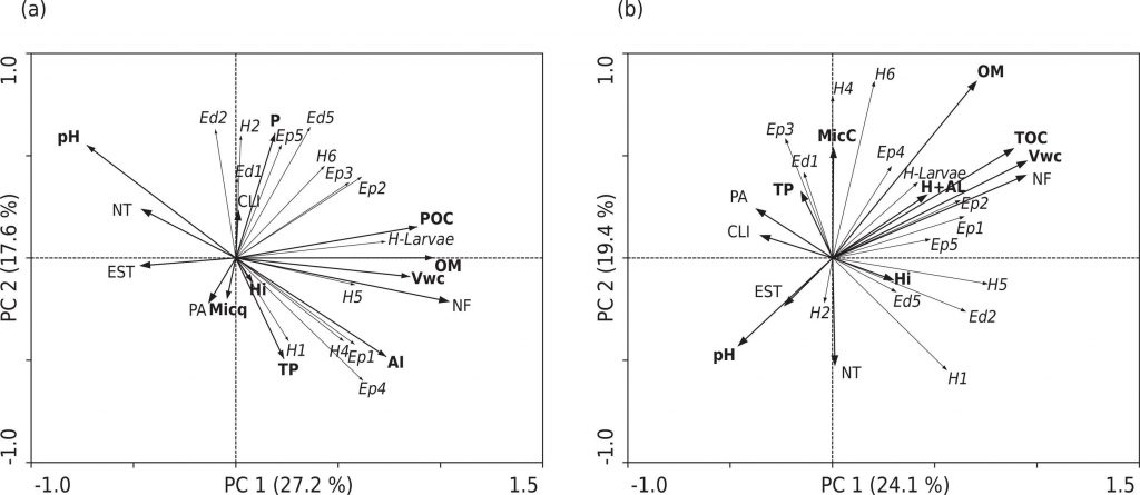 Coleopterans (Coleoptera) are major ecosystem service providers. However ecomorphological features that are comparable in a wide range of invertebrates within this group and in various environments must be found, to be able to study regions with different species, contributing to overcome difficulties of the taxonomic approach and understand the functioning of ecosystems. This research addressed the diversity of Coleoptera, using a methodology of ecomorphological traits, as well as their relation with the land use systems (LUS) and the soil properties. The following LUS were evaluated: no-tillage (NT), crop-livestock integration (CLI), pasture (PA), Eucalyptus stands (EST), and native forest (NF). Samples were collected using a 3 × 3 point grid (sampling points at a distance of 30 m), in winter and summer, in three municipalities on the Southern Santa Catarina Plateau, Brazil. Coleopterans were collected using the methodology recommended by the Tropical Soil Biology and Fertility Program, based on the excavation of soil monoliths, and on pitfall traps. To evaluate the biological forms (morphotypes) and ecomorphological groups, the ecomorphological index (EMI) methodology was adopted and the modified soil biological quality (SBQ) index was determined. At the same points, samples were collected to evaluate environmental variables (soil physical, chemical, and microbiological properties). Density data underwent nonparametric univariate statistical analysis and multivariate abundance to verify the distribution of coleopterans in the LUS, and the environmental variables were considered as explanatory. Regardless of the LUS, 14 morphotypes were identified, and adult coleopterans with epigean morphologic adaptations were more abundant than hemi-edaphic and edaphic coleopterans, respectively. Morphotype diversity was higher in the systems NF, EST, and PA in summer and in NT in winter. The reductions in SBQ index were not associated with a gradient of land use intensification (NF> EST> PA> CLI> NT), and the index was higher for NF and lower for EST. Principal component analysis (PCA) indicated a different distribution of invertebrates between the LUS. For the edaphic species, better adapted to life in the soil, a relation with NT and CLI was observed, due to more favorable pH values and phosphorus content. In the NF, a greater amount of morphotypes was identified, and the properties related to soil carbon dynamics contributed to explain this distribution. Separation at the morphotype level, taking adaptation level to soil life into consideration, has proved efficient to discriminate the LUS, mainly along with other explanatory environmental variables.