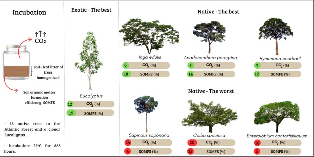 The use of native and exotic species in the reforestation of degraded areas has been considered an important strategy to improve soil quality. However, there is still scarce information about which species are more efficient for soil organic matter (SOM) formation. This study aimed to evaluate the decomposition of leguminous and non-leguminous tree litter, its impact on light organic matter (LOM), particulate organic matter (POM), and mineral-associated organic matter (MAOM) dynamics, and consequently, SOM formation efficiency. Leaf litter from 16 native trees to the Atlantic Forest and a clonal Eucalyptus were added to the soil (incubation experiment) to evaluate the decomposition and contribution to the formation/degradation of SOM for 888 hours. The relative contents of δ13C, N, P and C were assessed; the cumulative emission of C-CO2, potentially mineralizable C (C0), decomposition rate constant (k) and half-life time; calculation of the priming effect and physical fractionation, obtaining the LOM, POM and MAOM fractions. Cumulative emission of C-CO2 increased, especially in the first 204 hours. Non-leguminous species C. speciosa, S. saponaria and Trichilia sp. showed faster decomposition and greater mineralization potential. Lecythis sp. showed the lowest k (0.0058), suggesting better degradability. A. peregrina was the only species with a negative priming effect and a greater contribution to the LOM fraction. C. speciosa made a greater contribution to the POM fraction. The highest efficiency of SOM formation was observed in eucalyptus residues. The leguminous species A. peregrina, I. edulis, H. courbaril and P. gonoacantha also showed high SOM formation efficiency, higher contribution in the MAOM fraction, slower mineralization and lower respiration rates. I. edulis showed the lowest respiration and decomposition rates and the greatest contribution to SOM formation efficiency. Litter quality has a significantt influence on decomposition dynamics and SOM formation. In this way, the data can help in the selection of tree species with suitable functional characteristics aimed at optimizing ecosystem services, especially in relation to soil quality and the carbon cycle in reforestation and recovery programs for degraded areas in the Atlantic Forest.