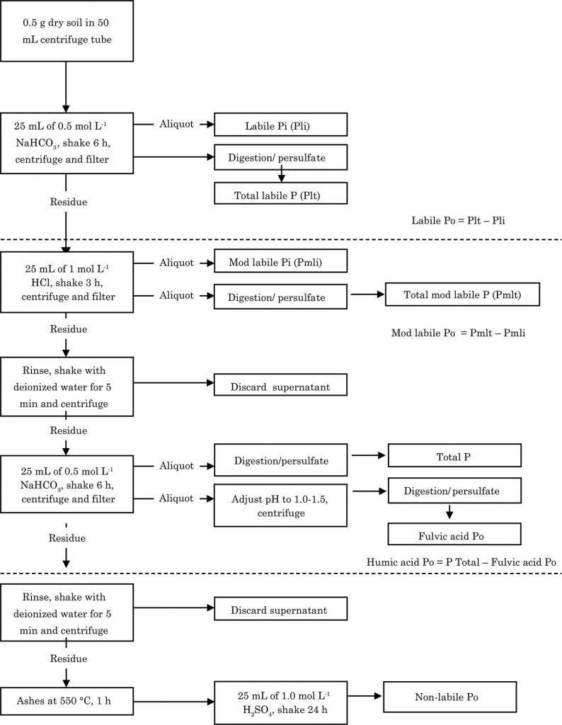 Inorganic phosphorus (Pi) usually controls the P availability in tropical soils, but the contribution of organic P (Po) should not be neglected, mainly in systems with low P input or management systems that promote organic matter accumulation. The aims of this study were to evaluate the changes in the Po fractions over time in soil fertilized and not fertilized with cattle manure and to correlate Po forms with available P extracted by anion exchange resin. The experiment was carried out under field conditions, in a sandy-clay loam Haplustox. The experimental design was a 2 × 9 randomized complete block factorial design, in which the first factor was manure application (20 t ha-1) or absence, and the second the soil sampling times (3, 7, 14, 21, 28, 49, 70, 91, and 112 days) after manure incorporation. Labile, moderately labile and non-labile Po fractions were determined in the soil material of each sampling. Manure fertilization increased the Po levels in the moderately labile and non-labile fractions and the total organic P, but did not affect the Po fraction proportions in relation to total organic P. On average, 5.1 % of total Po was in the labile, 44.4 % in the moderately labile and 50.5 % in the non-labile fractions. Available P (resin P) was more affected by the manure soluble Pi rather than by the labile Po forms. The labile and non-labile Po fractions varied randomly with no defined trend in relation to the samplings; for this reason, the data did not fit any mathematical model.