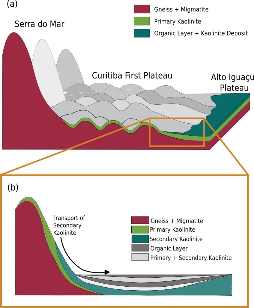 Kaolinite is the main clay mineral in most soils around the world and has been widely used for industrial purposes. This research aimed to study chemical, morphological and crystallographic characteristics of kaolinite, and establish the origin of kaolinitic samples on Serra do Mar and kaolinitic layers on peatlands, located at Southern Brazil. Samples were collected on different geomorphological positions: two samples at Serra do Mar (kaolinitic saprolite – SAP, and kaolinitic layers – KL); and two cores at the peatland with Sapric Histosols from Quaternary sedimentary basin. Granulometry and total organic carbon (TOC) were determined in soil samples. Kaolinite in silt and clay fractions was studied by chemical extractions, X-ray diffraction (XRD), thermal analysis (DTA/TG), and scanning electron microscopy with energy dispersive spectroscopy – SEM/EDS. Chemical and mineralogical characteristics of kaolinite were divided into two groups, according to the particle size and the location of the deposit in the relief. Silt fraction: i) SAP – genesis mainly derived from mica weathering; ii) peatland, containing pseudomorph crystals smaller than those found in Serra do Mar; Clay fraction: i) Serra do Mar – there was a larger contribution of K-feldspar weathering in the genesis of kaolinite from KL in relation to SAP; ii) peatland – the stronger weathering and the hydromorphic conditions resulted in less neoformed crystalline kaolinites. For both environments, the substitution of Al3+ by Fe3+ into the octahedral sheet led to a reduction in the mineral thickness and also increased the occurrence of structural deformations in clay kaolinite. Kaolinite in peatland is a combination of the following genesis processes: transportation from Serra do Mar (mainly in the silt fraction) and; formation in situ through neogenesis process (dominant in the clay fraction).