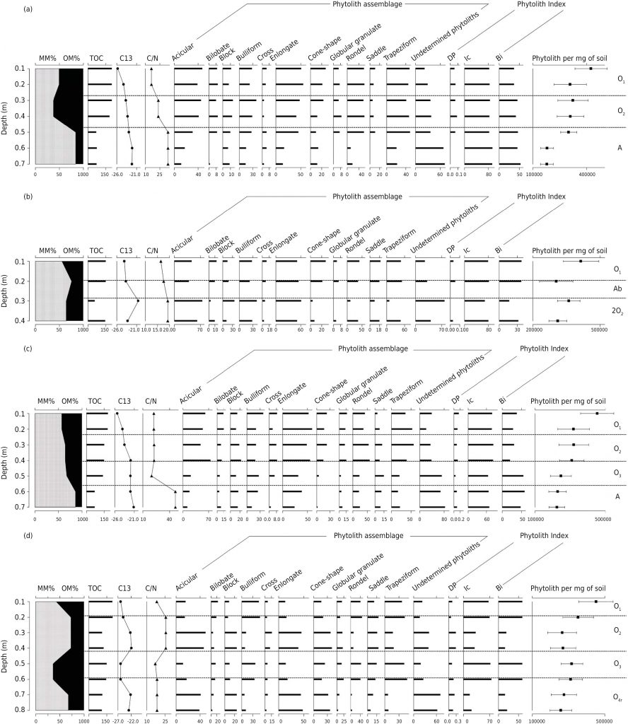 Records of changes in the phytosociological structure of vegetation can be observed more clearly in soils that have more significant accumulation of organic matter, like those occurring in high-mountain environments. The aim of this study was to characterize soils formed in high-mountain environments in the Itatiaia National Park (INP), state of Rio de Janeiro, southeastern Brazil, and to discuss the potential of preserved phytoliths as markers of vegetative history and environmental factors. Four profiles were selected, which were morphologically described and evaluated for their physical and chemical properties. For phytolith analysis and high-resolution determination of the stable carbon isotopes, samples were collected at 0.10 m intervals. The profiles showed highly similar morphological characteristics, with peat deposits and colluvial sediments as source material, produced in the highest parts of the landscape. High-mountain soils in the INP have properties related to high contents of organic matter, like high acidity, low base saturation, and high CEC values due to high H+ contents. The soils are formed by the addition of plant residues, which accumulate due to the cold and humid climate during most of the year in these environments. The phytolith assemblage had a high frequency of morphotypes characteristic of temperate, cold, and high elevation intertropical regions, especially of Pooideae plants. The phytolith indexes indicated open vegetation environments with a predominance of C3 grasses, suggesting cold climate conditions, and corroborating the δ13C isotopic values. The results of phytolith analysis of the profiles reflected characteristics related to soil genesis. Organism is the main soil formation factor, conditioned by the factors relief (elevation) and climate, which resulted in low temperatures and lead organic matter accumulation.
