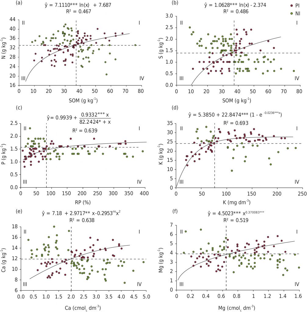 Research focused on adequate nutrition of plants is essential in modern coffee production to increase yield and develop more efficient management strategies with greater environmental and economic sustainability. The objectives of this study were to establish critical and optimal levels of soil fertility properties for high yielding Arabica coffee crops using the Boundary Line method and, then, relate the macronutrient contents in the diagnostic leaf of coffee to the macronutrients available in the soil using the Quadrant Diagram of the Plant-Soil Relationship (QDpsR). The study made use of a soil chemical analysis database, leaf macronutrient contents, and Arabica coffee yield from five representative coffee-growing regions in Minas Gerais. An analysis of data consistency was performed, and relative fruit yield (RFY) was related to the soil organic matter (SOM), P, K, Ca, and Mg contents in the soil, establishing the boundary line (BL) in each graph. Equations were adjusted from the BL points, and the equation that best fit was selected. Using the QDpsR method, the response plane was divided into four quadrants, where the total leaf contents of N, P, K, Ca, Mg, and S were plotted as a function of the contents of SOM, P, K, Ca, and Mg in the soil, on the y and x axes of the Cartesian coordinate system. The regression equations were adjusted to the pairs of points (y, x) of quadrants III and I and were used to estimate the macronutrient sufficiency ranges from the critical and optimal levels in the soil. The BL method was used to determine the class of good soil fertility for SOM, P, K, Ca, and Mg. The QDpsR method allows determination of response curves for leaf content as a variable of soil contents, making it possible to estimate the sufficiency ranges in the diagnostic leaf of coffee: 33.4-35.8 g kg-1 of N, 1.4-1.6 g kg-1 of P, 24.4-27.0 g kg-1 of K, 11.9-13.6 g kg-1 of Ca, 3.8-4.5 g kg-1 of Mg, and 1.4-1.8 g kg-1 of S; which were consistent with the sufficiency ranges considered suitable for the crop. This study demonstrated the importance of leaf analysis as a tool for evaluation of the nutritional status of Arabica coffee since the technique is consistent with the theoretical principles underlying it.