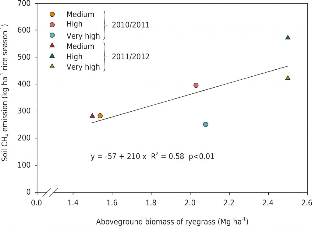 Rice yield increases in response to improvements in crop management, but the impact on greenhouse gas (GHG) emissions in the subtropical region of Southern Brazil remains unknown. A three-year field study was developed aiming to evaluate the impact that an increase in crop management levels (high and very high) has on soil methane (CH4) and nitrous oxide (N2O) emissions, as compared to the level (medium) currently adopted by farmers in Southern Brazil. Differences in crop management included seed and fertilizer rates, irrigation, and pesticide use. The effect of crop management levels on the annual partial global warming potential (pGWP = CH4 × 25 + N2O × 298) ranged from 7,547 to 17,711 kg CO2eq ha−1 and this effect was larger than on the rice grain yield (9,280 to 12,260 kg ha−1), resulting in approximately 60 % higher yield-scaled GHG with the high crop management level compared to the current level. Soil CH4 emissions accounted for 98 % of pGWP in the flooded rice season, whereas N2O prevailed during the drained non-rice season (≈65 %). Although it was impossible to relate emissions to any individual input or practice, soil CH4 emissions in the rice season were linearly related to the biomass produced by the rice crop (p<0.01) and by ryegrass in the previous non-rice season (p<0.1), both of which were possibly related to the supply of labile C for methanogenesis. A future increase in rice yield as a result of the adoption of improved crop management may require additional agricultural practices (e.g., intermittent irrigation) to offset the increased GHG emissions.