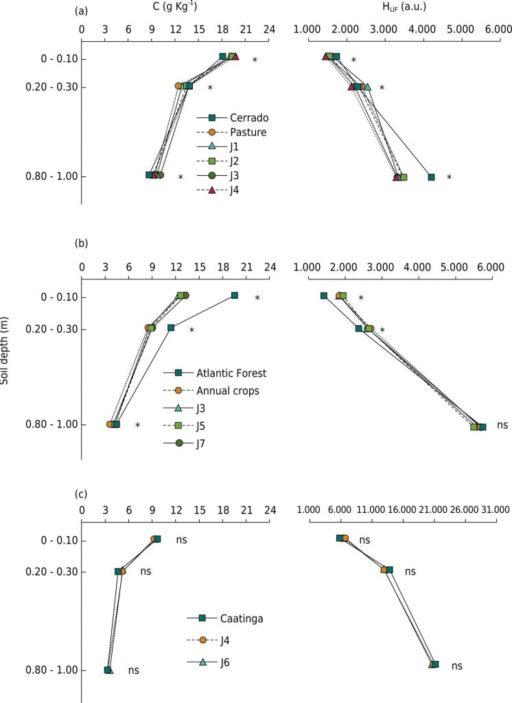 The substitution of native vegetation by agricultural ecosystems can change the quantity and quality of soil organic matter (SOM), and the intensity of these changes depends on the soil type, climate, and land use. The objective of this study was to evaluate the quality of organic matter in chronosequences of Jatropha cultivation in contrasting soil and climatic conditions. Soil samples were evaluated at depths of 0.00-0.10, 0.20-0.30, and 0.80-1.00 m in chronosequences located in Planaltina, Distrito Federal (Cerrado-Pasture-Jatropha), Dourados, Mato Grosso do Sul (Atlantic Forest-Corn-Jatropha), and Araripina, Pernambuco (Caatinga–Jatropha). To assess SOM quality, we determined C contents in the SOM fractions, C stocks, the carbon management index (CMI), the SOM humification index (HLIF), and the C and N concentrations in the microbial biomass. The conversion of native vegetation to agropastoral systems changed the composition of SOM in the biomes evaluated, especially in the surface layers. The CMI and the C and N contents in the microbial biomass were the most responsive to land use changes in all the biomes studied. The pasture improved SOM quality by increasing the CMI (116) and the C content by 8, 21, and 6 % in the organic, mineral, and organomineral fractions, respectively, while maintaining the SOM humification index and the C and N contents in the microbial biomass in the 0-0.10 m layer. The lowest values of C in the SOM fractions, the CMI (52), and C microbial biomass (136 mg kg-1) were observed for annual crops. Jatropha cultivation increased C contents in the SOM fractions, C stocks, the CMI, and C and N in the microbial biomass with an increase in cultivation time, which demonstrates the potential of this long-term system for improving SOM quality.