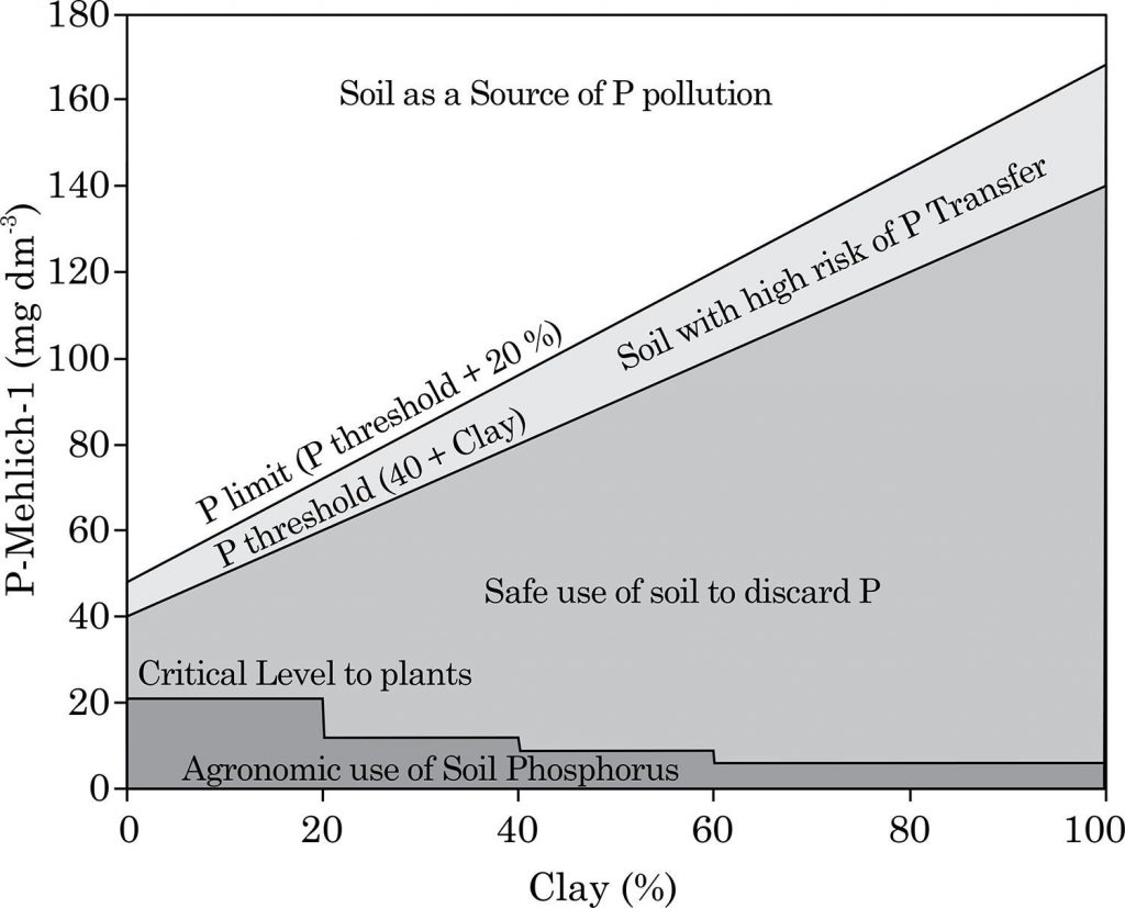 The State of Santa Catarina, Brazil, has agricultural and livestock activities, such as pig farming, that are responsible for adding large amounts of phosphorus (P) to soils. However, a method is required to evaluate the environmental risk of these high soil P levels. One possible method for evaluating the environmental risk of P fertilization, whether organic or mineral, is to establish threshold levels of soil available P, measured by Mehlich-1 extractions, below which there is not a high risk of P transfer from the soil to surface waters. However, the Mehlich-1 extractant is sensitive to soil clay content, and that factor should be considered when establishing such P-thresholds. The objective of this study was to determine P-thresholds using the Mehlich-1 extractant for soils with different clay contents in the State of Santa Catarina, Brazil. Soil from the B-horizon of an Oxisol with 800 g kg-1 clay was mixed with different amounts of sand to prepare artificial soils with 200, 400, 600, and 800 g kg-1 clay. The artificial soils were incubated for 30 days with moisture content at 80 % of field capacity to stabilize their physicochemical properties, followed by additional incubation for 30 days after liming to raise the pH(H2O) to 6.0. Soil P sorption curves were produced, and the maximum sorption (Pmax) was determined using the Langmuir model for each soil texture evaluated. Based on the Pmax values, seven rates of P were added to four replicates of each soil, and incubated for 20 days more. Following incubation, available P contents (P-Mehlich-1) and P dissolved in the soil solution (P-water) were determined. A change-point value (the P-Mehlich-1 value above which P-water starts increasing sharply) was calculated through the use of segmented equations. The maximum level of P that a soil might safely adsorb (P-threshold) was defined as 80 % of the change-point value to maintain a margin for environmental safety. The P-threshold value, in mg dm-3, was dependent on the soil clay content according to the model P-threshold = 40 + Clay, where the soil clay content is expressed as a percentage. The model was tested in 82 diverse soil samples from the State of Santa Catarina and was able to distinguish samples with high and low environmental risk.