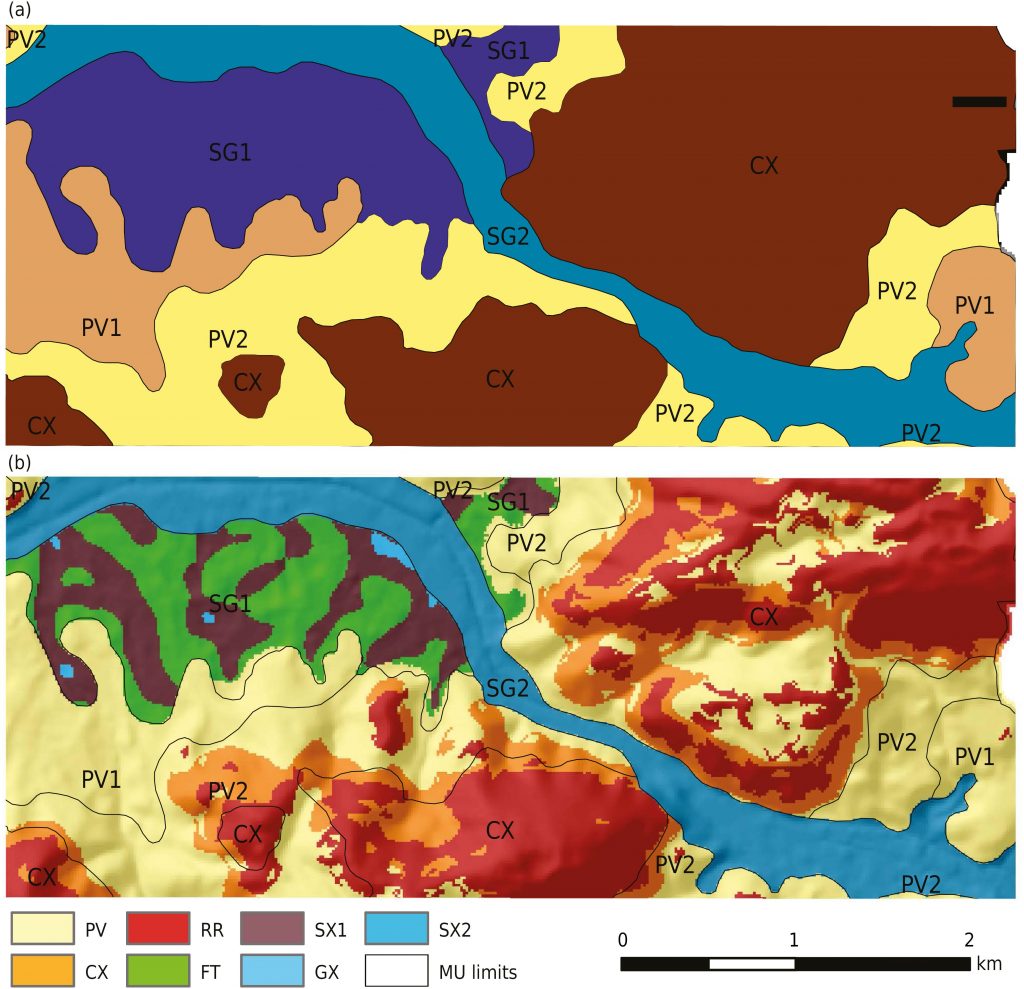 Soil surveys often contain multi-component map units comprising two or more soil classes, whose spatial distribution within the map unit is not represented. Digital Soil Mapping tools supported by information from soil surveys make it possible to predict where these classes are located. The aim of this study was to develop a methodology to increase the detail of conventional soil maps by means of spatial disaggregation of multi-component map units and to predict the spatial location of the derived soil classes. Three digital maps of terrain variables – slope, landforms, and topographic wetness index – were correlated with the soil map and 72 georeferenced profiles from the Porto Alegre soil survey. Explicit rules that expressed regional soil-landscape relationships were formulated based on the resulting combinations. These rules were used to select typical areas of occurrence of each soil class and to train a decision tree model to predict the occurrence of individualized soil classes. Validation of the soil map predictions was conducted by comparison with available soil profiles. The soil map produced showed high agreement (80.5 % accuracy) with the soil classes observed in the soil profiles; Ultisols and Lithic Udorthents were predicted with greater accuracy. The soil variables selected in this study were suitable to represent the soil-landscape relationships, suggesting potential use in future studies. This approach developed a more detailed soil map relevant to current demands for soil information and has potential to be replicated in other areas in which data availability is similar.