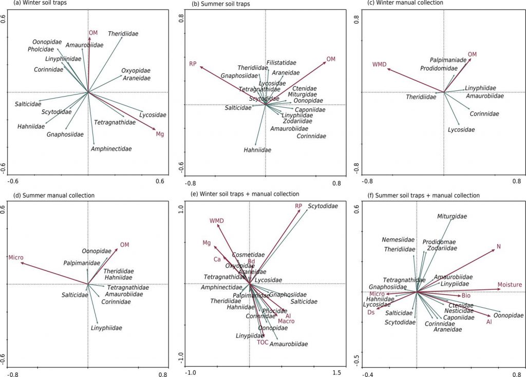 Changes in land use management in agricultural areas can affect the biodiversity of spider families. This study aimed to evaluate spider diversity in different land use systems with capture by two sampling methods, and to identify soil properties that can modulate the occurrence of spiders. Five land use systems, representative of traditional agricultural areas, were evaluated in the west of Santa Catarina, Brazil, to establish a scale of land use intensity: native forest, eucalyptus reforestation areas, pastures, crop-livestock integration areas, and annual crops under no-tillage. The collection methods were manual from soil monoliths and soil traps. Altogether 479 individuals were captured, which were distributed among 20 families, 40 genera, and 8 species. Principal component analysis separated the land use systems and showed an association of spider families with land use in the two sampling methods. There was reduction in spider diversity as the intensity of land use increased. The manual collection method was more efficient for families of soil spiders, whereas traps were more efficient for epigeic spiders. The Lycosidae family was more resistant to environmental pressures, while Oonopidae and Amaurobiidae were more sensitive to environmental modifications. The differences in the spider communities were explained by the following soil properties: organic matter, mean weight-diameter of soil aggregates, and resistance to penetration, which were associated with the degree of anthropic intervention in the land use systems.
