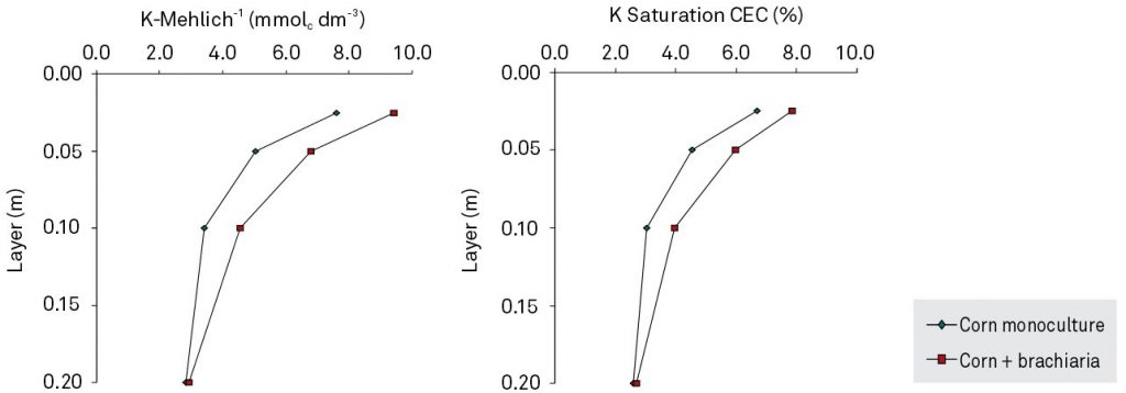 Corn intercropped with Urochloa brizantha (Syn, Brachiaria brizantha) has been indicated as a suitable alternative management practice for rational land use in crop-livestock production systems in the Cerrado region of Brazil. An experiment was carried out in Maracaju, MS, Brazil to evaluate the effect of sequences of soybean/second-crop corn systems intercropped with Urochloa brizantha and the effects of forms of nitrogen on soil chemical and physical properties. A randomized block experimental design was used with four replications; treatments were in a 2 × 4 factorial arrangement with two systems of crop management: second-crop corn intercropped with Urochloa brizantha, and monoculture of second crop corn; and four forms of topdressing N: urea, urea + ammonium sulfate, ammonium sulfate, and no N supply. The following chemical properties were evaluated: soil organic matter and exchangeable K contents, cation exchange capacity, base saturation, and K saturation; as well as the physical properties: soil bulk density and aggregate stability. Crop residue cover and agronomic traits of soybean were also assessed. Intercropping induced significant differences in crop residue cover, plant height, soybean yield, stand, 100-seed weight, soil organic matter, exchangeable K, and K saturation in the exchange complex. There was no significant effect of the crop sequences on soil bulk density and mean weight and geometric mean diameter of water-stable aggregates. No significant effect of forms of N was observed on any chemical or physical properties, or on those related to soybean development.