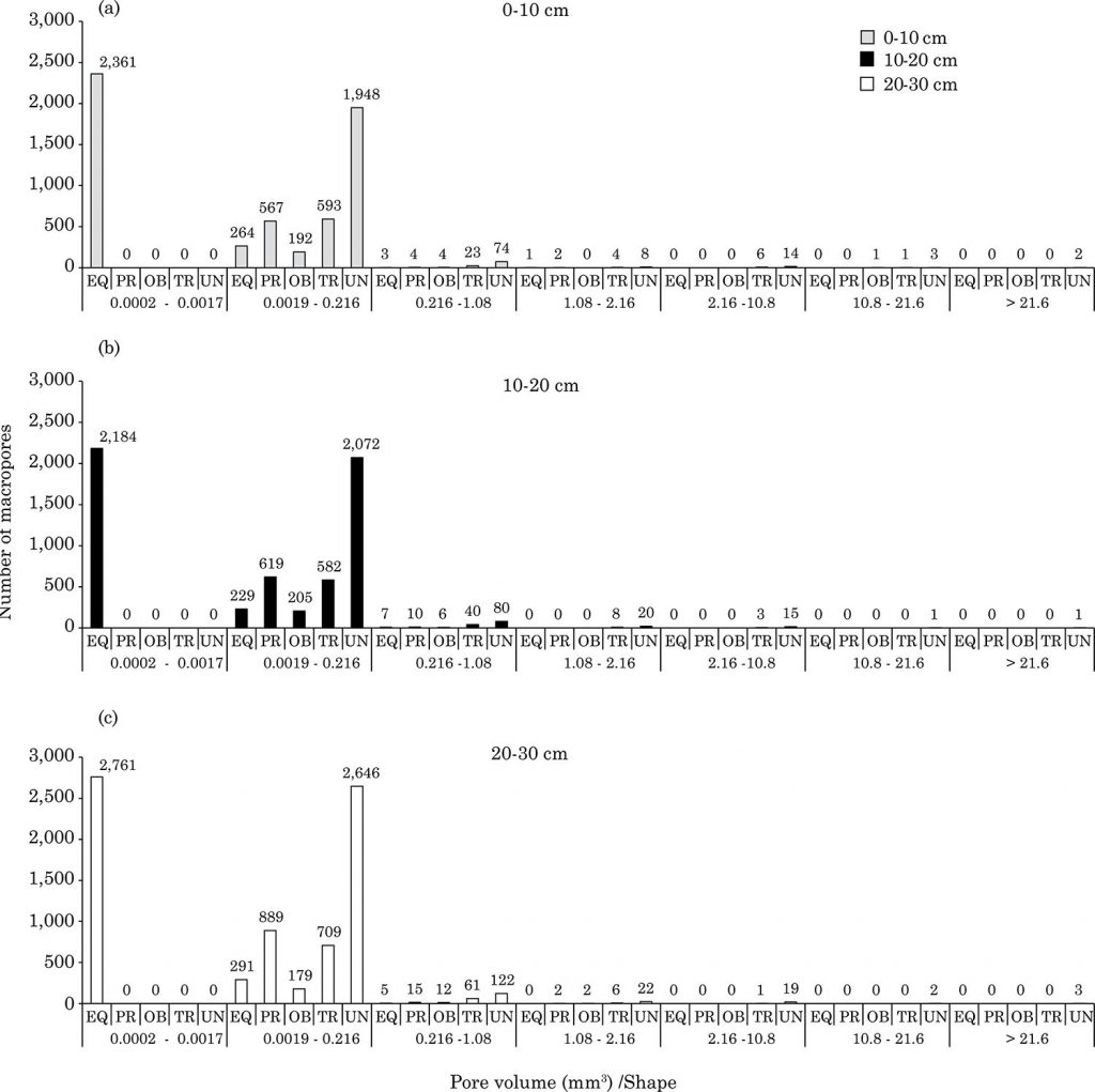Analysis of the soil pore system represents an important way of characterizing soil structure. Properties such as the shape and number of pores can be determined through soil pore evaluations. This study presents a three-dimensional (3D) characterization of the shape and number of pores of a sub-tropical soil. To do so, a second generation X-ray microtomograph equipped with a plain type detector was employed. A voltage of 120 kV and current of 80 mA was applied to the X-ray tube. The soil samples analyzed were collected at three different depths (0-10, 10-20, and 20-30 cm). The results obtained allowed qualitative (images) and quantitative (3D) analyses of the soil structure, revealing the potential of the microtomographic technique, as well as the study of differences in soil macroporosity at different depths. Macroporosity was 5.14 % in the 0-10 cm layer, 5.10 % in the 10-20 cm layer, and 6.64 % in the 20-30 cm layer. The macroporosity of unclassified pores (UN) was 0.30 % (0-10 and 10-20 cm) and 0.40 % (20-30 cm), while equant pores (EQ) had values of 0.01 % at the three depths under analysis.