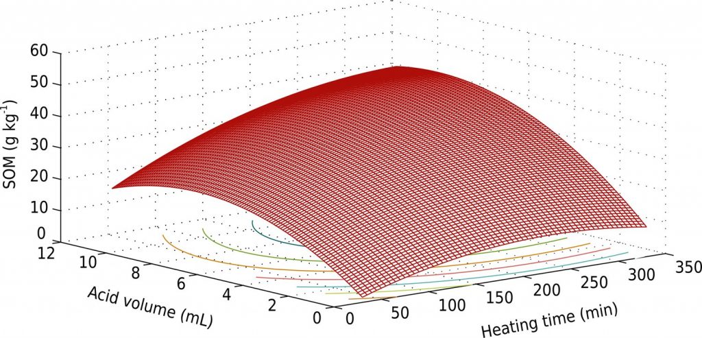 Soil organic matter (SOM) is important to fertility, since it performs several functions such as cycling, water and nutrient retention and soil aggregation, in addition to being an energy requirement for biological activity. This study proposes new trends to the Embrapa, Walkley-Black, and Mebius methods that allowed the determination of SOM by spectrophotometry, increasing functionality. The mass of 500 mg was reduced to 200 mg, generating a mean of 60 % saving of reagents and a decrease of 91 % in the volume of residue generated for the three methods without compromising accuracy and precision. We were able to optimize conditions for the Mebius method and establish the digestion time of maximum recovery of SOM by factorial design and response surface. The methods were validated by the estimate of figures of merits. Between the methods investigated, the optimized Mebius method was best suited for determining SOM, showing near 100 % recovery.