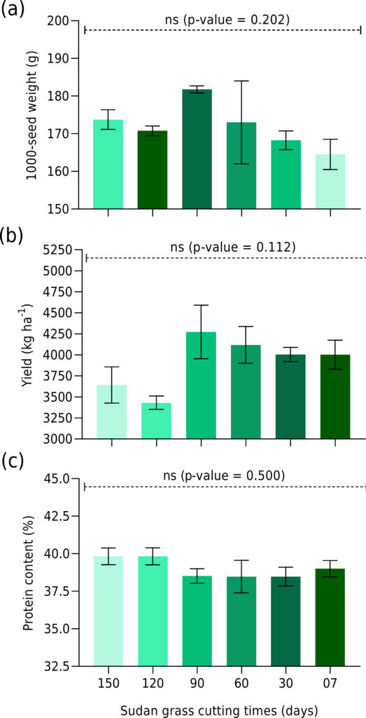 Sudan grass (Sorghum sudanense (Piper) Stapf.) shows potential as a cover crop under the no-tillage system in soybean growing under the conditions of the Brazilian Cerrado region, due to high biomass production under water deficit. The large amount of biomass produced can improve soil microbiological activity, but may also negatively affect subsequent soybean yield due to nutrient competition, particularly if termination of the cover crop is delayed. To improves the use of Sudan grass as a cover crop, this study aimed to evaluate the most suitable time for terminating Sudan grass to balance the maintenance of soil biological quality and increased soybean yield. Experiment was conducted in a randomized block design, with four replications, evaluating six cutting times for Sudan grass: 150, 120, 90, 60, 30, and 7 days before soybean sowing (DBSS). Early cutting of Sudan grass did not negatively affect soil biological properties; cutting at 150 DBSS led to a significant (p≤0.05) increase in microbial biomass carbon (111 mg kg-1) and the microbial quotient (41 mg kg-1). In addition, early cutting at 150 DBSS increased the concentration of S-SO42- in the soil (13 mg dm-3). Early cutting at 150, 98, and 67 DBSS led to increases in soybean foliar concentrations of Cu (12 mg kg-1), P (4.11 g kg-1), and K (24 g kg-1), respectively. However, these increases in soybean foliar concentrations did not result in higher grain yield, 1000-seed weight, or grain protein content. Therefore, Sudan grass can be incorporated as a cover crop in a no-tillage system in the soybean off-season in the northeastern Cerrado region of Brazil. It is possible to cut the Sudan grass up to 7 days before sowing soybean without harmful effects on soybean yield. However, early cutting of Sudan grass is recommended to increase the efficiency of carbon incorporation into the microbial biomass.