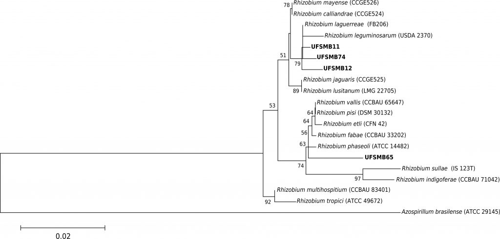 Areas affected by coal mining can be recovered by revegetation with leguminous plants associated with nitrogen-fixing bacteria. This study addressed the isolation and characterization of native nitrogen-fixing bacteria from coalmine wasteland under different vegetation restoration approaches using Macroptilium atropurpureum (DC) Urb and Vicia sativa L. as trap plants. The bacteria were characterized and identified on the basis of 16S rRNA sequences. Additionally, nitrogen-fixing strains were characterized for tolerance to high heavy metal and low pH levels, as well as for their effect on growth, nodulation, and symbiotic efficiency of M. atropurpureum and V. sativa. Soil samples were taken from the rhizosphere of eight areas, between 6 and 20 years under vegetation restoration, in the coal mining area of Candiota, RS-Brazil. The following properties were evaluated: colony characterization on solid “79” culture medium; pH (3.0-9.0) and heavy metal (Cr, Cd, Zn, Cu, and Ni) tolerance; partial sequencing of 16S rRNA gene; presence of nodA and nifH genes and symbiotic efficiency. A total of 115 isolates, i.e., 77 from M. atropurpureum and 38 from V. sativa, were obtained. The tolerance of these isolates is high for a wide range of pH levels and heavy metal contents, and 18 among them were selected for symbiotic efficiency and 16S rRNA sequencing. Inoculated with M. atropurpureum, the strains UFSM-B53, UFSM-B64, and UFSM-B74 had high symbiotic efficiency. The nitrogen-fixing bacteria were classified in the genera Rhizobium, Bradyrhizobium, and Burkholderia. The results indicate the potential of these native rhizospheric bacterial strains as inoculants and biofertilizers for legume species under pH and heavy metal stress in coal mining degraded areas in Southern Brazil.