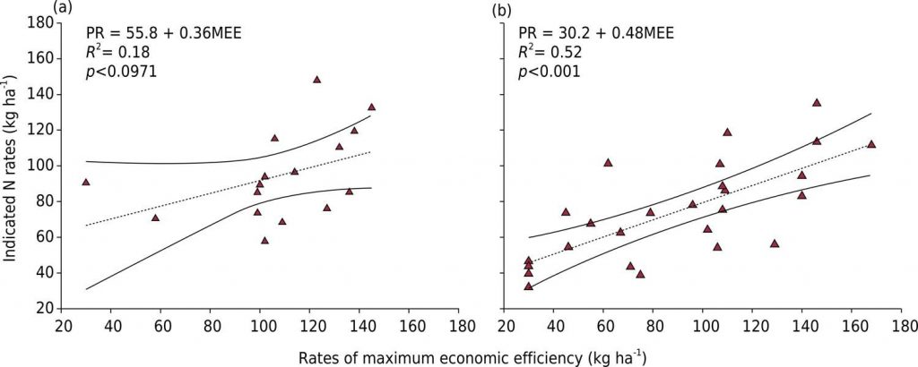 High winter cereal yields depend on an adequate supply of nitrogen (N). We developed a system for indicating N rates for wheat and barley in the South-Central region of the state of Paraná, Brazil, using results of 72 field experiments conducted from 2007 to 2012. The N rates recommended for winter cereals were estimated to supply the amounts of N fertilizer needed to obtain increasing yields (<3.5, 3.5-4.5, 4.5-5.5, and >5.5 Mg ha-1) of crops grown after soybean and corn on soils with a variable organic matter content (<40, 40-60, and >60 g dm-3). The apparent mineralization rate of soil N was estimated to be 1 % and the N fertilization efficiency 50 %. The N rates recommended for wheat ranged from 30 to 150 kg ha-1 when cultivated after soybean, and from 30 to 170 kg ha-1 after corn. The N rates for barley ranged from 30 to 120 kg ha-1 when grown after soybean, and from 30 to 130 kg ha-1 after corn. These N rates are consistent with those indicated by the Soil Fertility Commission for the states of Rio Grande do Sul and Santa Catarina (CQFS-RS/SC, 2016), and also with the rates of maximum economic efficiency estimated in our study. The proposed N rate recommendation system can be used by agricultural technicians and producers to manage N fertilization of wheat and barley in the South-Central region of Paraná, Brazil.