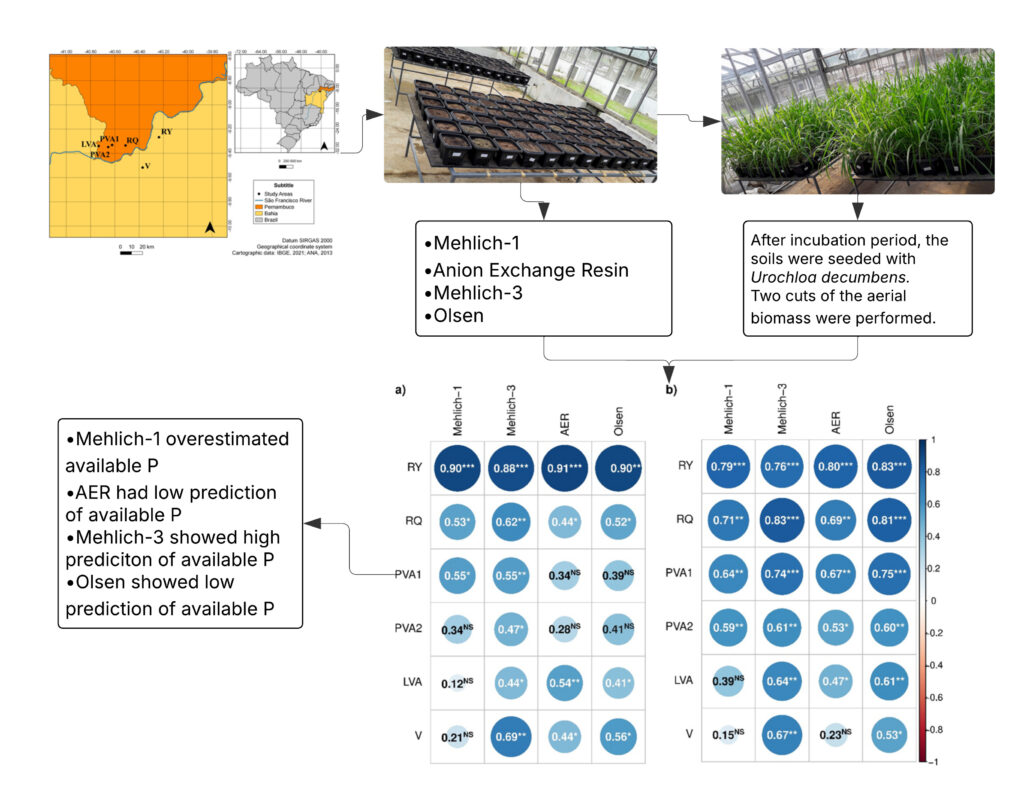 Phosphorus (P) is one of the most used nutrients in agriculture due to its high degree of interaction with the soil. It is susceptible to calcium precipitation in poorly weathered and alkaline soils, such as those in the Brazilian Semi-Arid region. Mehlich-1 is the most used extractor to evaluate P availability in this region. However, there are controversies regarding the efficiency of Mehlich-1 and the anion exchange resin (AER) has been an alternative extractor to evaluate P availability. However, AER has not yet proven its efficiency in this region. Additionally, other extractors such as Mehlich-3 and Olsen need to be evaluated. This study aimed to correlate soil properties in an alkaline environment with the P extracted by Mehlich-1, AER, Mehlich-3 and Olsen extractors and assess the performance of these extractors in predicting P availability for Urochloa decumbens in representative soils of the sub-middle São Francisco Valley. An experiment was carried out with samples of six representative soils from productive areas of the sub-middle São Francisco Valley, Brazil. Soils were incubated with increasing P rates and after 30 days, soil samples were collected for P determination by the extractors Mehlich-1, AER, Mehlich-3, and Olsen, relating this extraction to soil properties. Soils were seeded with U. decumbens to determine biomass production and P accumulated in plant biomass, correlating this accumulation with the P extraction capacity of the extractors. Exchangeable Ca2+ content and soil pH influenced the P extraction rate more than clay and P-rem content. Mehlich-1 extractor overestimated available P. Anion exchange resin was also influenced by soil properties and showed low prediction of P availability. In contrast, Olsen extractor was not influenced by soil properties, but showed low prediction of available P. The pH of Mehlich-3 extracts was little altered during P extraction in the different soils, with the extraction of P influenced by the exchangeable Ca2+ contents and pH. However, Mehlich-3 showed high performance in predicting P availability in alkaline environments, suggesting that soil properties such as exchangeable Ca2+ and pH should be considered when P availability is evaluated in alkaline soils.