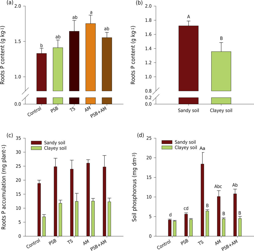 Soybean inoculated with phosphorus-solubilizing bacteria and co-inoculated with arbuscular mycorrhizal fungi in clay and sandy soils