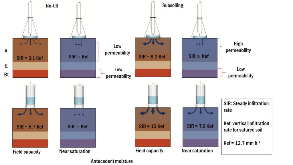 Soil steady water infiltration rate (SIR) is a key variable in hydrological modeling, but its relationship to antecedent soil moisture is not yet well understood. We tested the hypothesis that the SIR decreases with the increase in antecedent moisture, and that this relationship depends on permeability to water on the soil surface, the measurement method, and the measurement period. We conducted an experiment in an Argissolo Vermelho-Amarelo Distrófico abrúptico (Psammentic Paleudult – Soil Taxonomy), measuring infiltration in up to 14 antecedent moisture conditions under two soil structural conditions (no-till and no-till with subsoiling), with two measurement methods (double ring and Cornell infiltrometers), and for up to 48 h, with ten replications. In addition, vertical effective hydraulic conductivity of the saturated profile (Kef) was determined with Darcy’s equation for N layers. Crop succession used in the area was black oats and ryegrass in the winter and soybean in the summer. The SIR decreased to as little as 7.7 % of its original value with the increase in antecedent moisture; it was ~200 % greater in the treatment with subsoiling compared to no-till alone, and ~80 % greater when measured with the Cornell infiltrometer than with the double ring infiltrometer. Nevertheless, the effects of the method and the soil structural condition declined with the increase in antecedent moisture, confirming our hypothesis. In soil initially nearly saturated (degree of saturation ~90 %), the SIR drew near Kef (12.7 mm h-1) under the two soil structural conditions, especially when measured with the double ring infiltrometer. In contrast, increasing the time for measuring infiltration (>2 h) did not generate a new lower SIR level. The SIR decreases with the increase in antecedent soil moisture, and this relationship depends on the permeability to water of the surface layers and the measurement method. The SIR determined with infiltrometers better corresponds to vertical infiltration the nearer the soil is to saturation before beginning measurement.